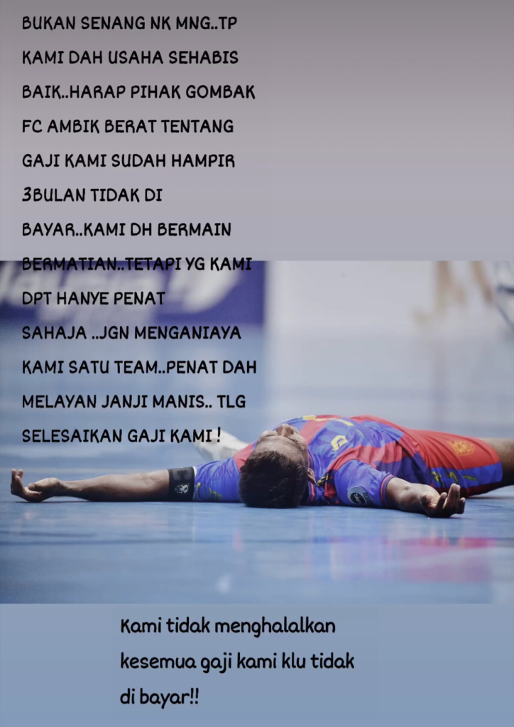 Ridhwan wrote, “It is not easy to win; we have tried our best. Please, Gombak FC, consider our salaries, which have not been paid for almost three months. We have played hard, but all we got was tiredness. Don’t mistreat us as a team. I’m tired of empty promises. Please settle our salaries. We do not waive our right to be paid.”