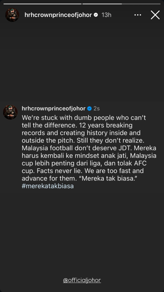 In a strongly worded message posted on his Instagram Story, Tunku Ismail lashed out at outdated mindsets within the local football ecosystem, suggesting that JDT has far outgrown the structure and mentality of Malaysian football.